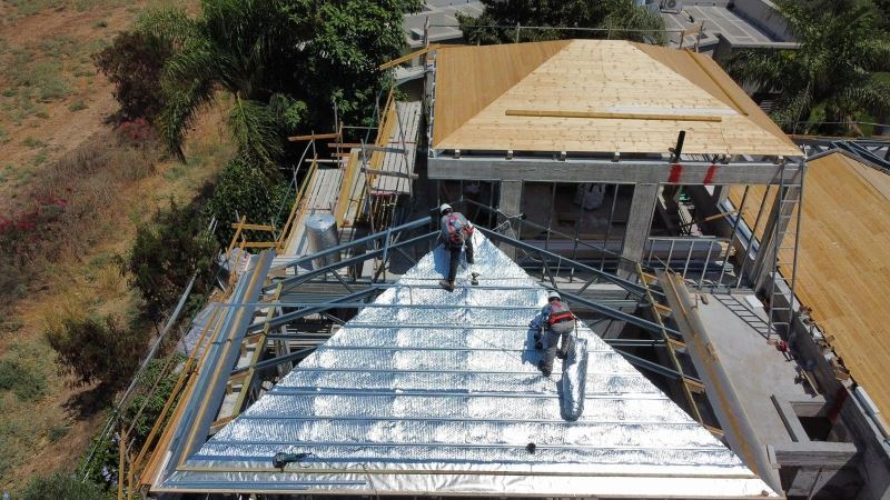 העבודה בוצעה בבית מגורים צמוד קרקע במושב אורות, במסגרת בנייה חדשה. צוות ההתקנה פרס שכבת בידוד תרמי מסוג פולינום אולטרה על גג המבנה, תוך התאמה לקונסטרוקציה ולחיבורים השונים. ההתקנה בוצעה במהלך שלבי הבנייה הפתוחים, לרבות עבודה סביב קורות הפלדה ומפגשי חומר שונים. לאחר השלמת הפריסה נערכה סקירה לוודא שהשכבה מונחת בצורה אחידה ומתואמת לכלל חלקי הגג.